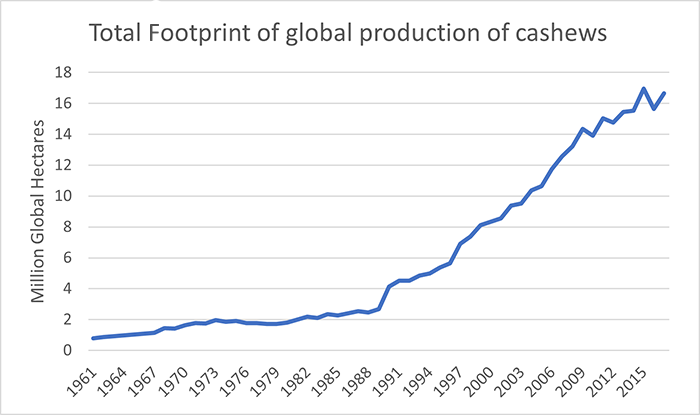 Cashews are produced at a higher rate than other nuts like almonds, walnuts, and hazelnuts, making their rise in popularity even more distinct. The ecological footprint associated with the production of cashews, which includes the cropland, built-up land, and carbon emissions required for their harvest and processing, has grown by almost 20% from 2010 to 2017.